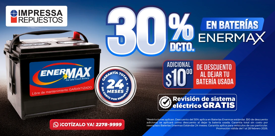 *Restricciones aplican. Descuento del 30% aplica en Baterías Enermax estándar. $10 de descuento adicional se aplicará como descuento al dejar la batería usada. Garantía total sin costo por reemplazo. Baterías Enermax Estándar 24 meses. Garantía aplica para vehículos de uso particular. Promoción válida del 1 al 28 febrero 2026.
