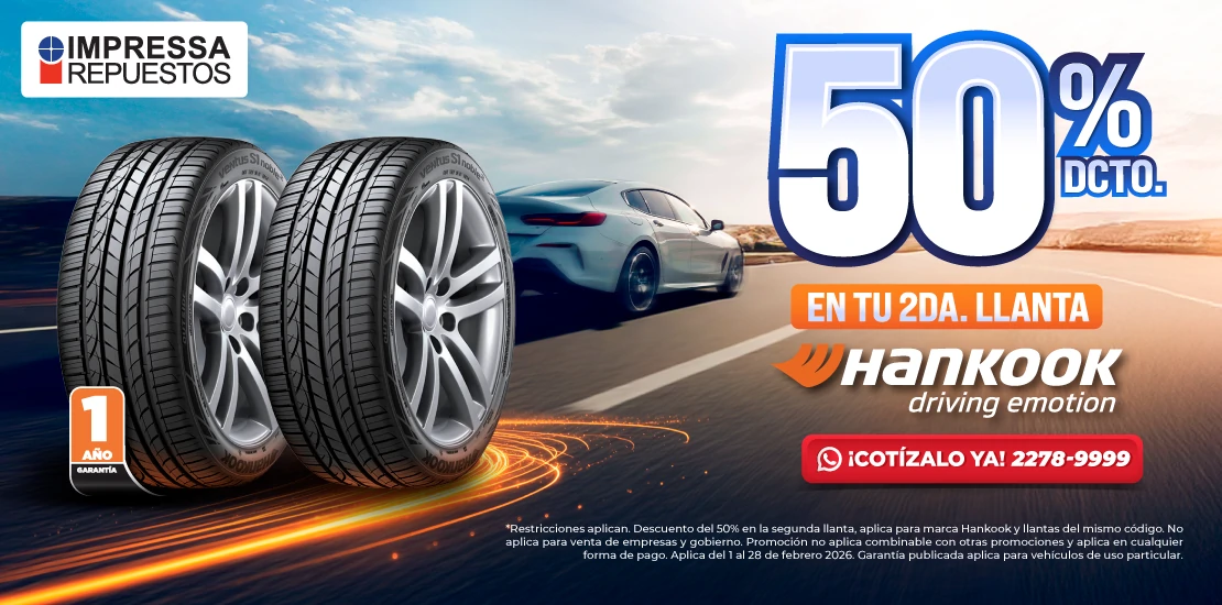 *Restricciones aplican. Descuento del 50% en la segunda llanta, aplica para marca Hankook y llantas del mismo código. No aplica para venta de empresas y gobierno. Promoción no aplica combinable con otras promociones y aplica en cualquier forma de pago. Aplica del 1 al 28 de febrero 2026. garantía publicada aplica para vehículos de uso particular.