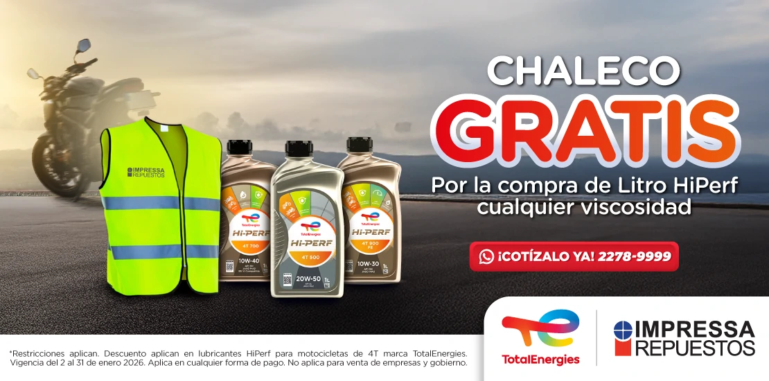 *Restricciones aplican. Válido una promoción por persona y/o factura. Al comprar 1 LT de lubricante para moto HI-PERF de TotalEnergies en viscosidades 10W40 4T, 10W30 4T y 20W50 4T, se entregará un chaleco reflectivo gratis. Promoción no aplica combinable con otras promociones y aplica en cualquier forma de pago. Aplica del 1 al 28 de febrero 2026.