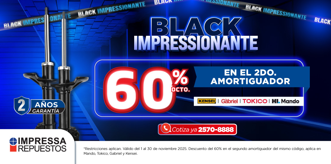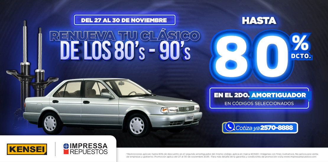 *Restricciones aplican, hasta 80% de descuento en el segundo amortiguador del mismo código, aplica en marca KENSEI. Aplica para amortiguadores de suspensión. No aplica para amortiguadores de dirección y compuerta. Imágenes con fines ilustrativos. No aplica para venta de empresas y gobierno. Promoción aplica del 27 al 30 de noviembre 2025. Aplica en cualquier forma de pago. Tiempo de garantía publicado aplica para vehículos de uso particular. Para más detalle de la garantía y condiciones de promoción visita www.impressarepuestos.com