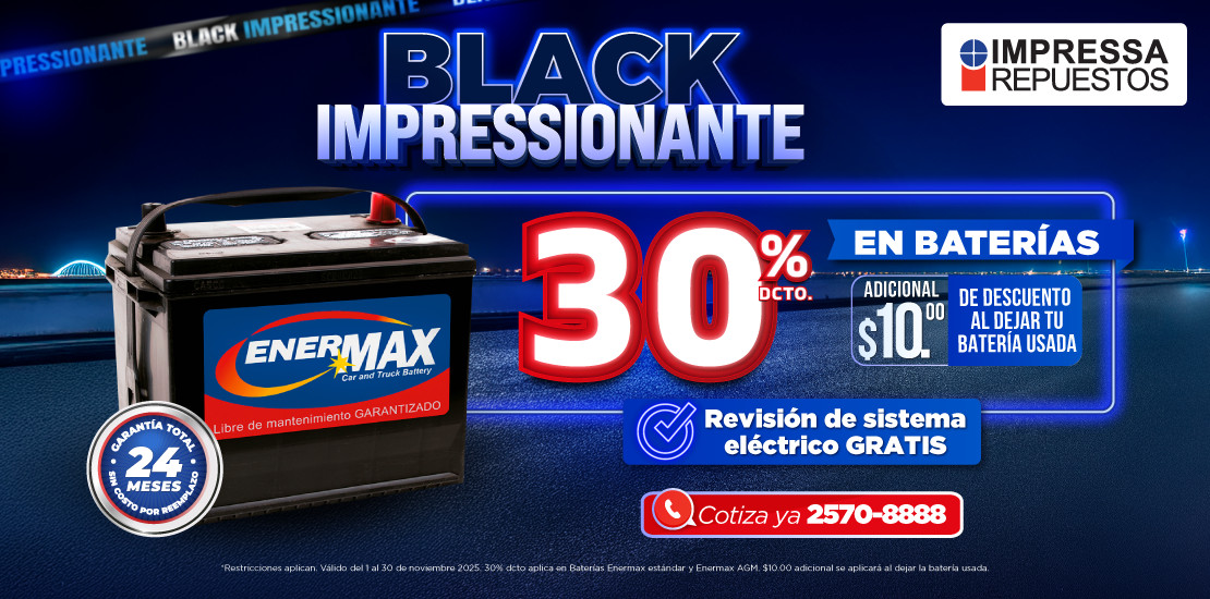 *Restricciones aplican. Descuento del 30% aplica en Baterías Enermax estándar. $10 de descuento adicional se aplicará como descuento al dejar la batería usada. Garantía total sin costo por reemplazo en Baterías Enermax 24 meses. Garantía aplica para vehículos de uso particular. Promoción válida del 1 al 30 de noviembre 2025.