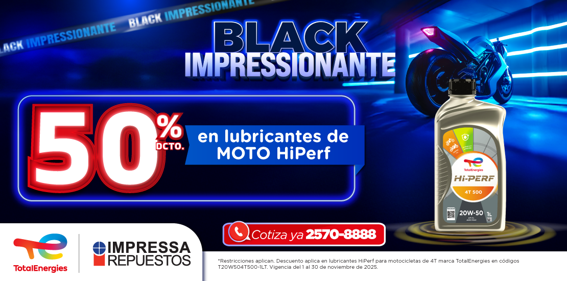 **Restricciones aplican. Descuento aplican en lubricantes HiPerf para motocicletas de 4T marca TotalEnergies en códigos T20W504T500-1LT. Vigencia del 1 al 30 de noviembre 2025. Aplica en cualquier forma de pago, no aplica para venta de empresas y gobierno.