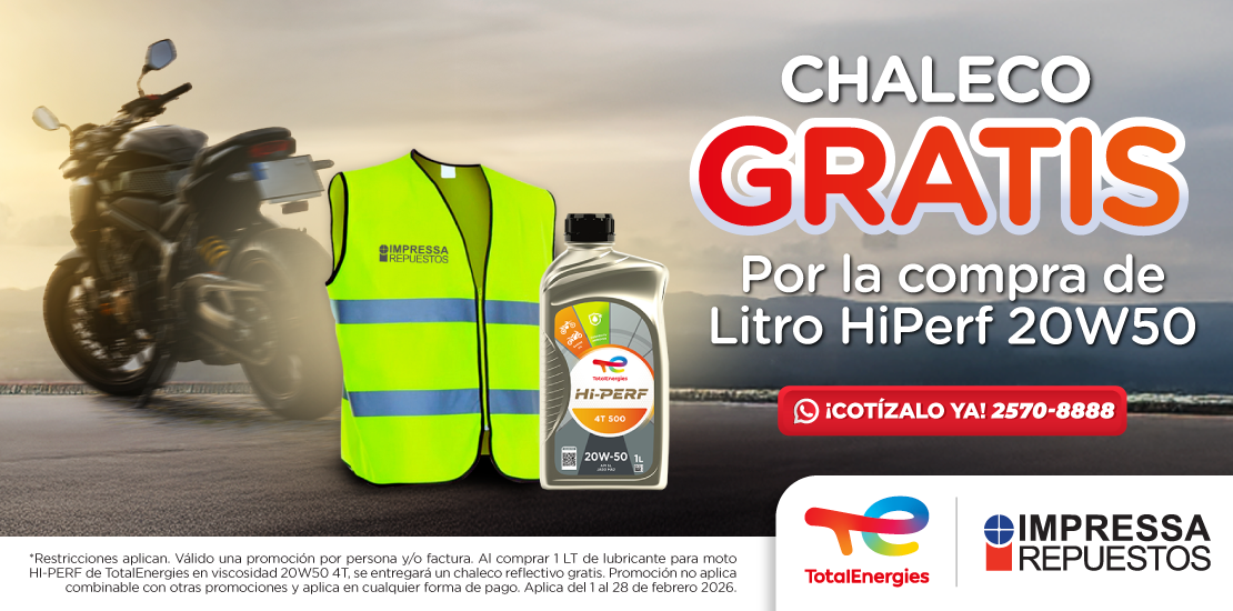 *Restricciones aplican. Válido una promoción por persona y/o factura. Al comprar 1 LT de lubricante para moto HI-PERF de TotalEnergies en viscosidades 10W40 4T, 10W30 4T y 20W50 4T, se entregará un chaleco reflectivo gratis. Promoción no aplica combinable con otras promociones y aplica en cualquier forma de pago. Aplica del 1 al 28 de febrero 2026.